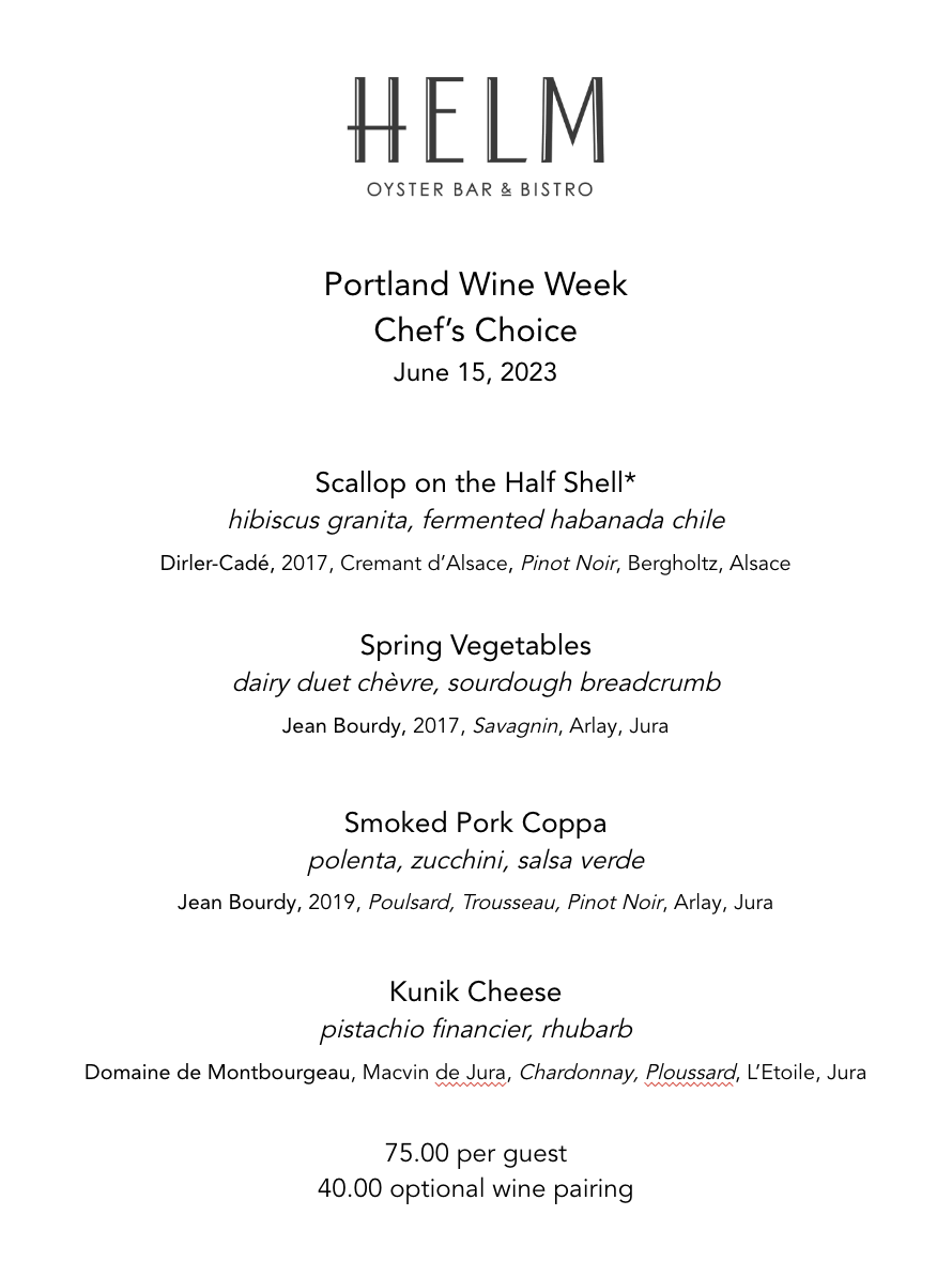 DETAILS: For Portland Wine Week, Helm will be offering an optional 4-course Chef’s Choice dinner menu in addition to their full menu. Sommelier Lizzie Legere will pair each dish with a beautiful wine. See the menu below.